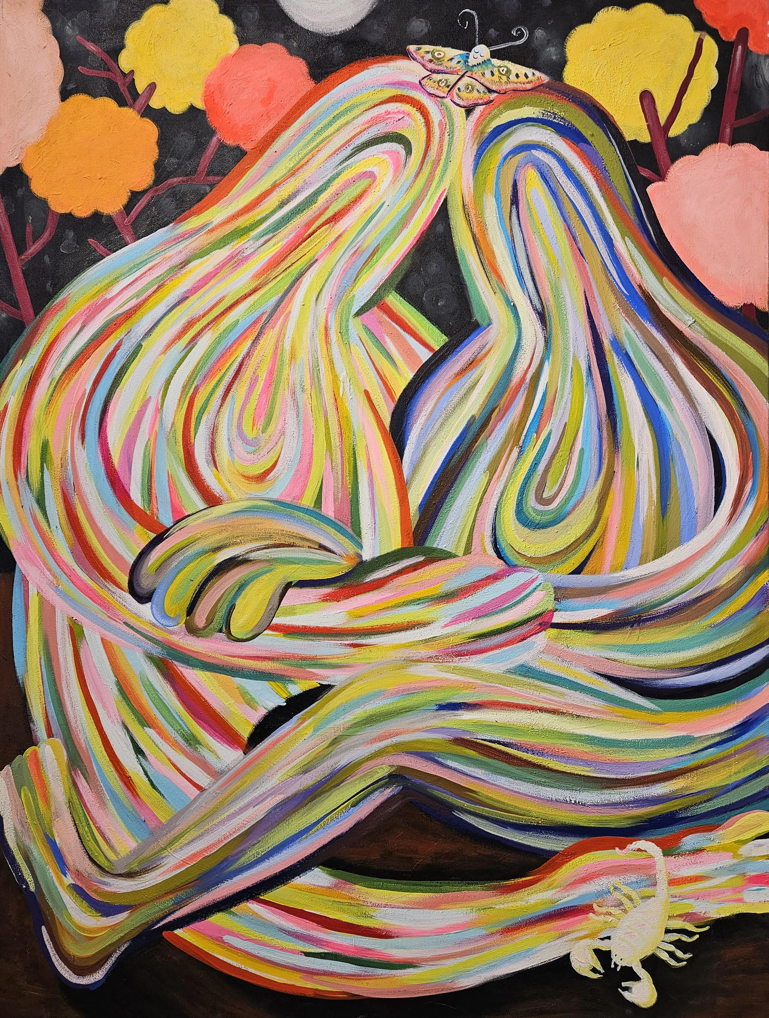 Martinez’s space became the living room of a chosen family, its salon-style cluster of color-blocked portraits mapping a web of influence and affection. In the FIGURATIVE zone of QUEER MAGNETISM, contemporary artists depict their loved ones and themselves, often obscuring or fragmenting queer and trans bodies to evoke intense emotional states, foster empathy, and offer tender protection.